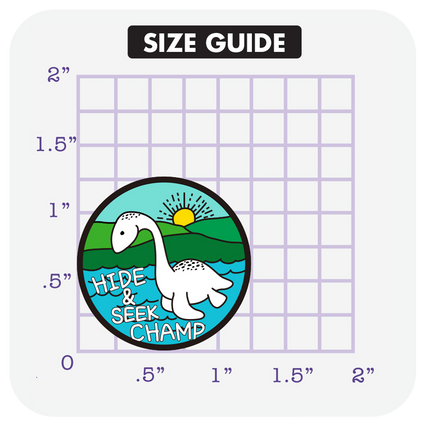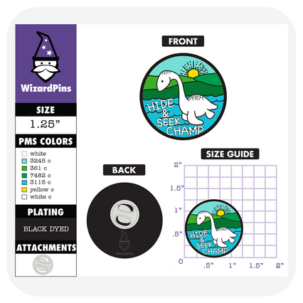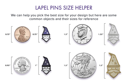 We include a size grid showing exactly how large the pin will be. When we list a size, we're using the longest dimension between the height and width. Our most popular size is 1".